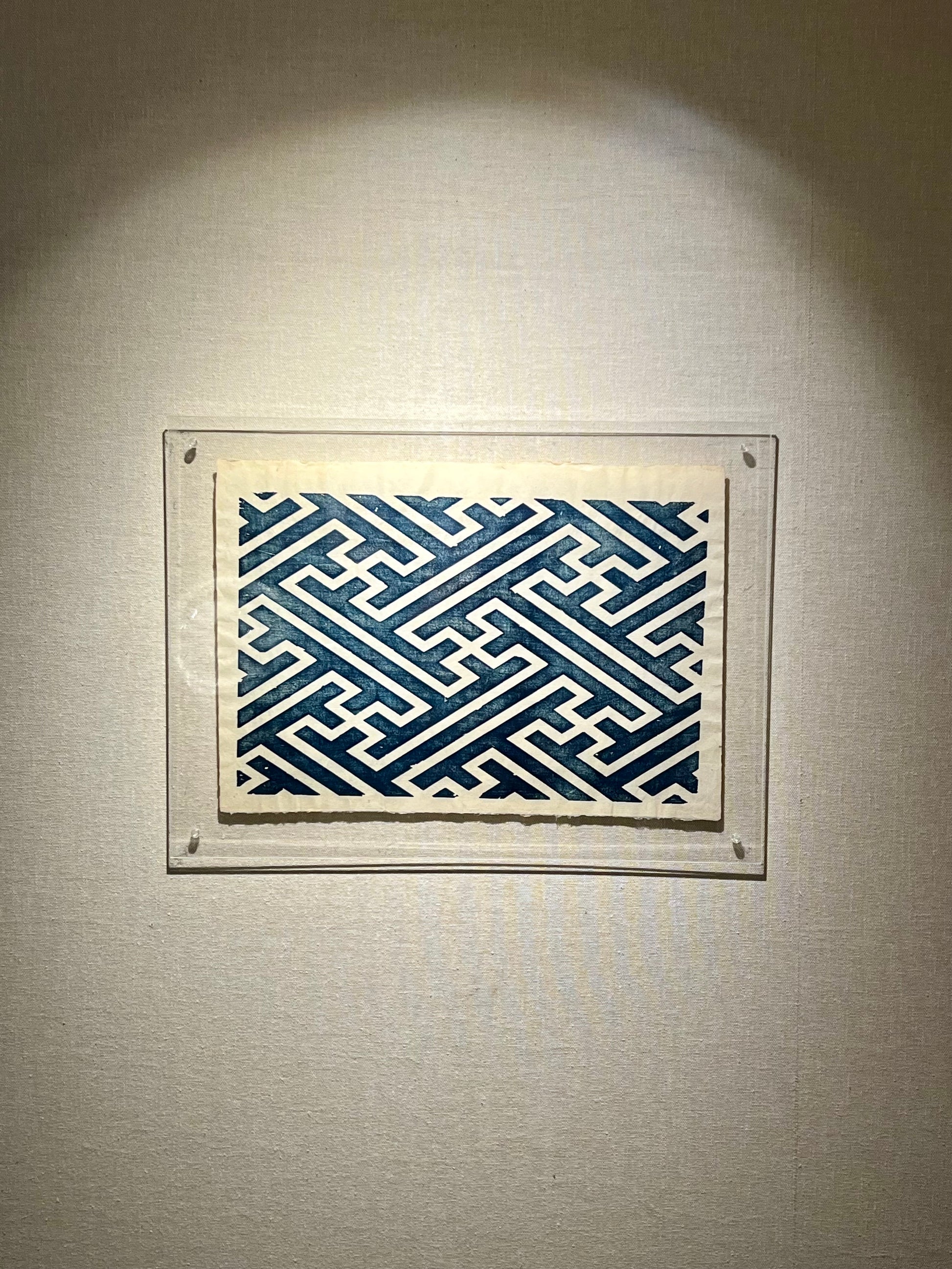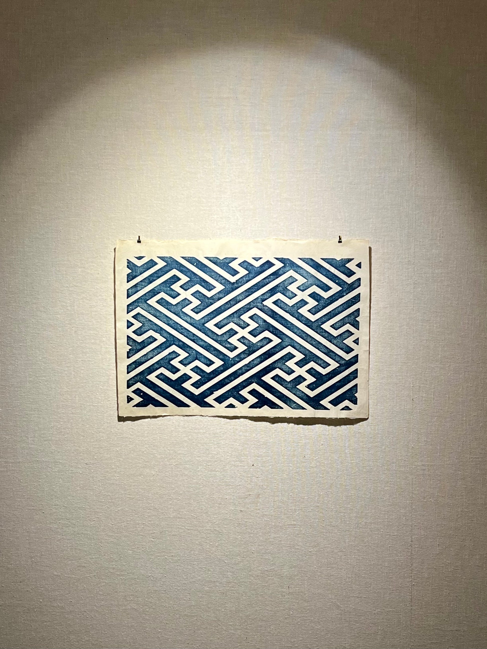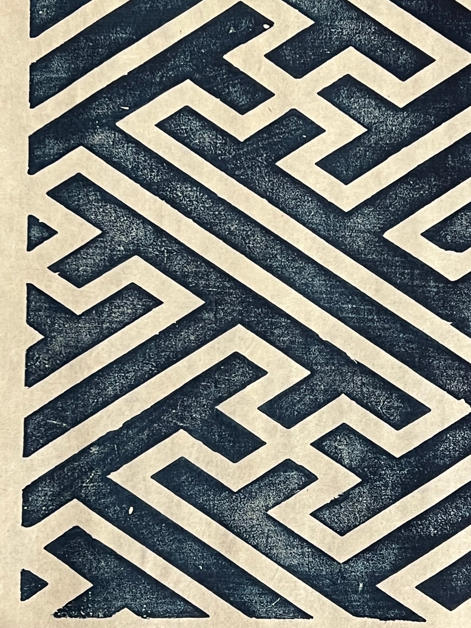 盛岡城内襖紙のために彫られた版木から、20世紀に入って和紙に摺写したものです。和紙も手漉き、顔料も詫びた良い色彩です。質実剛健な武士の襖柄ですが、現代でも通用するデザインです。
