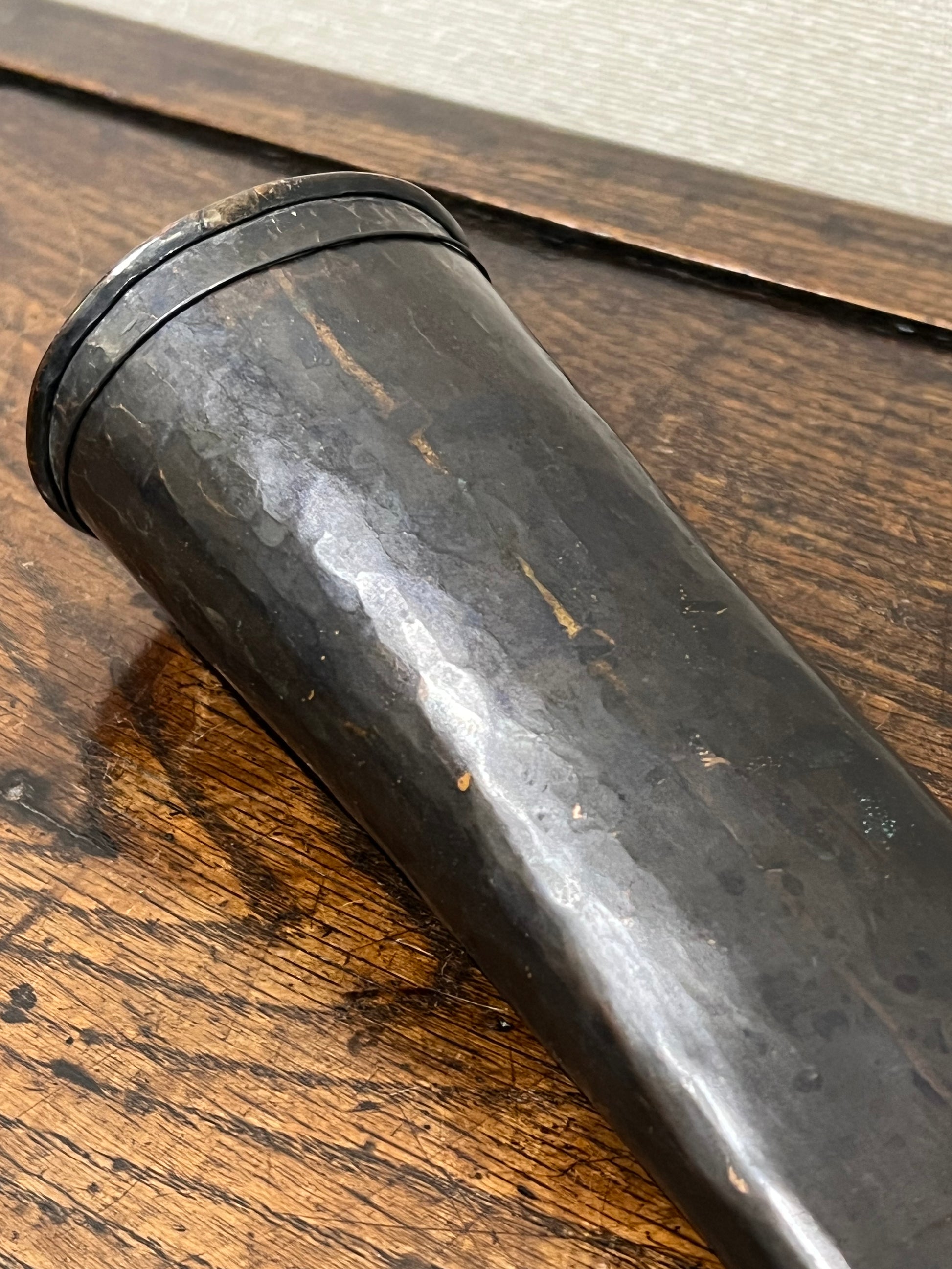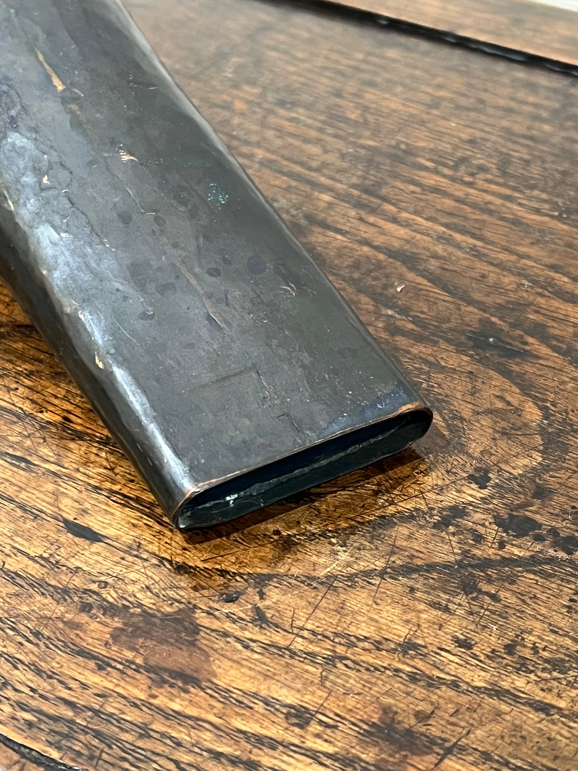 銅板を丹念に打ち出した手作りです。表面は防錆処理がされていますが、所々下地の銅板が透けて見えます。銅それも楔形の掛花入れは珍しいです。20世紀。直水可です。