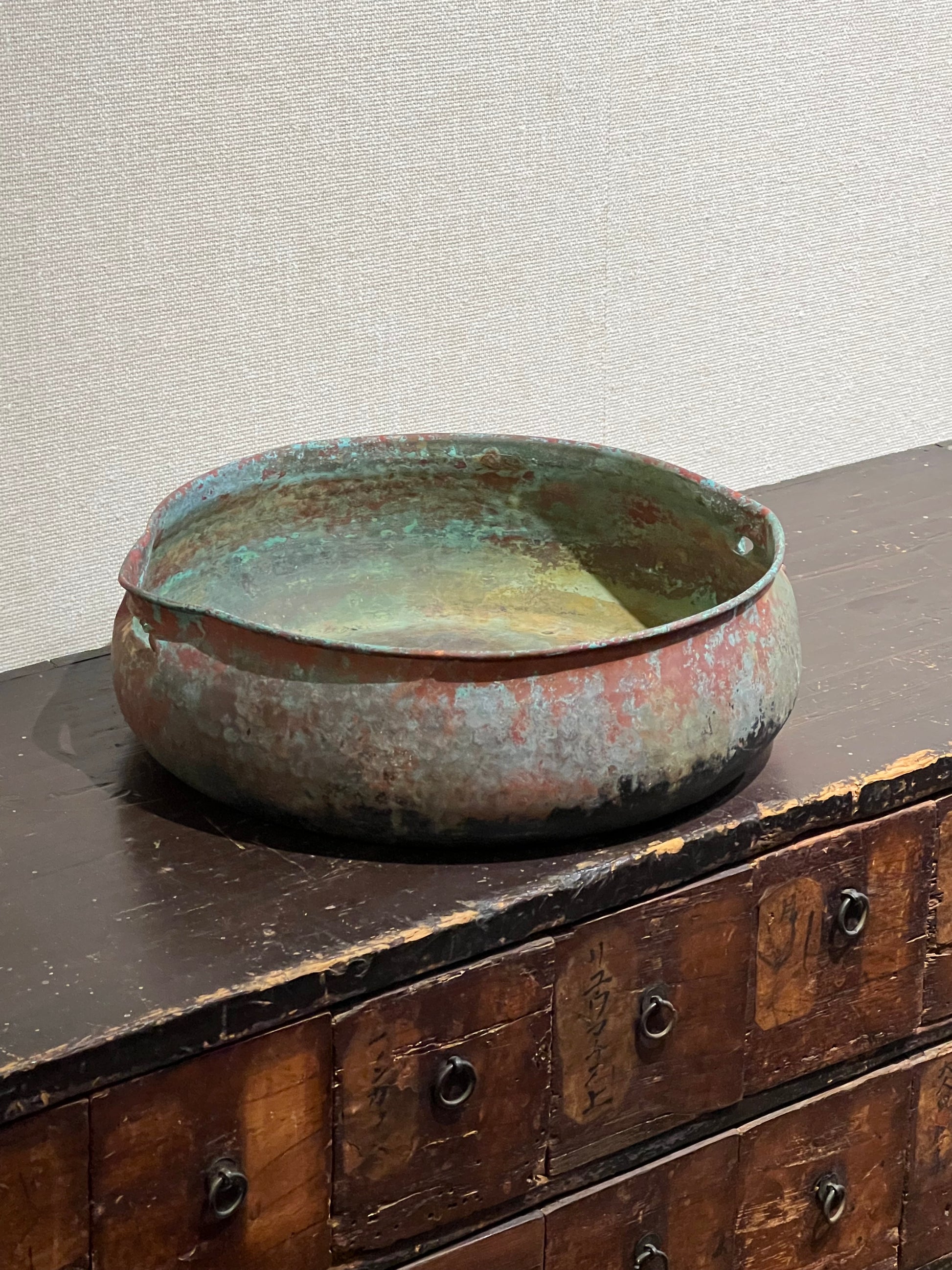 本来の用途は不明ですが、おそらく両手付の赤銅鍋だったのではないでしょうか。両の持ち手は取れて使用痕バリバリです。白百合を生けたいと思いましたが季節ではないので諦めました。直水可です。「花に勝たず、花に負けない」ありそうでない水盤です。20世紀。