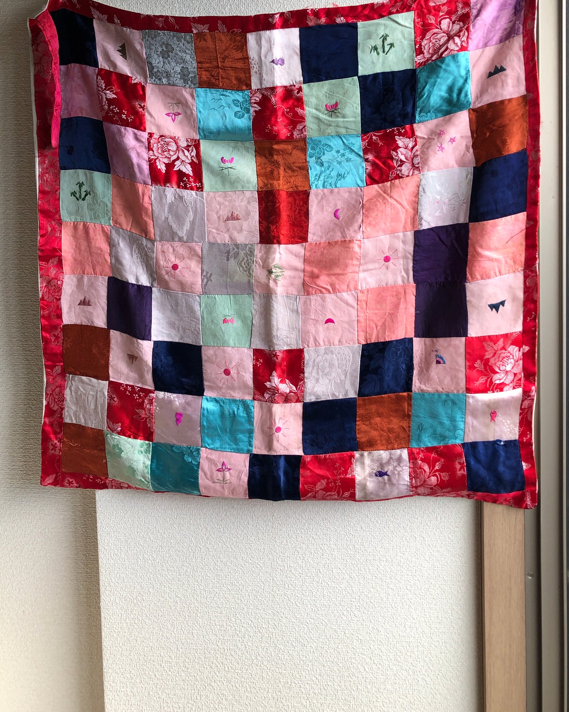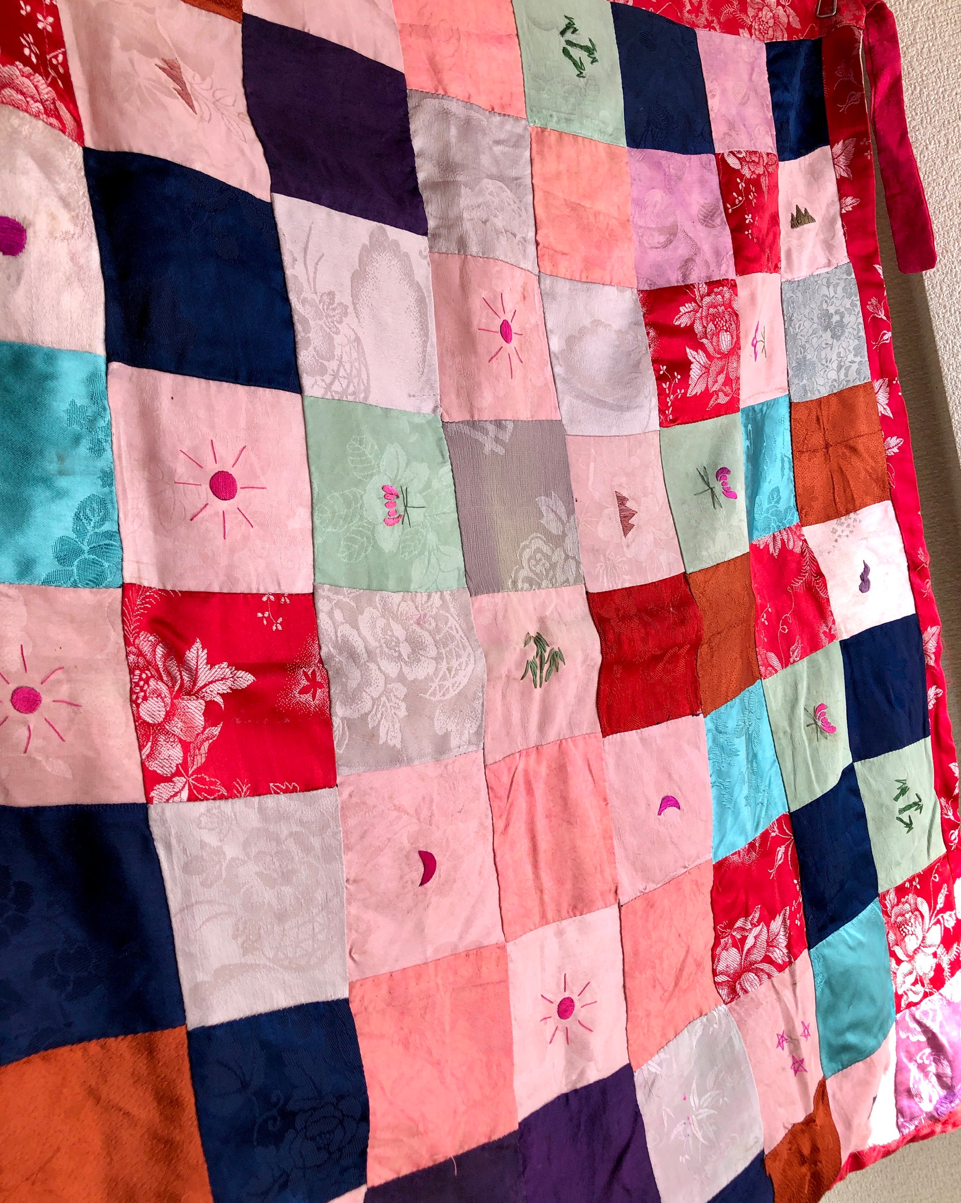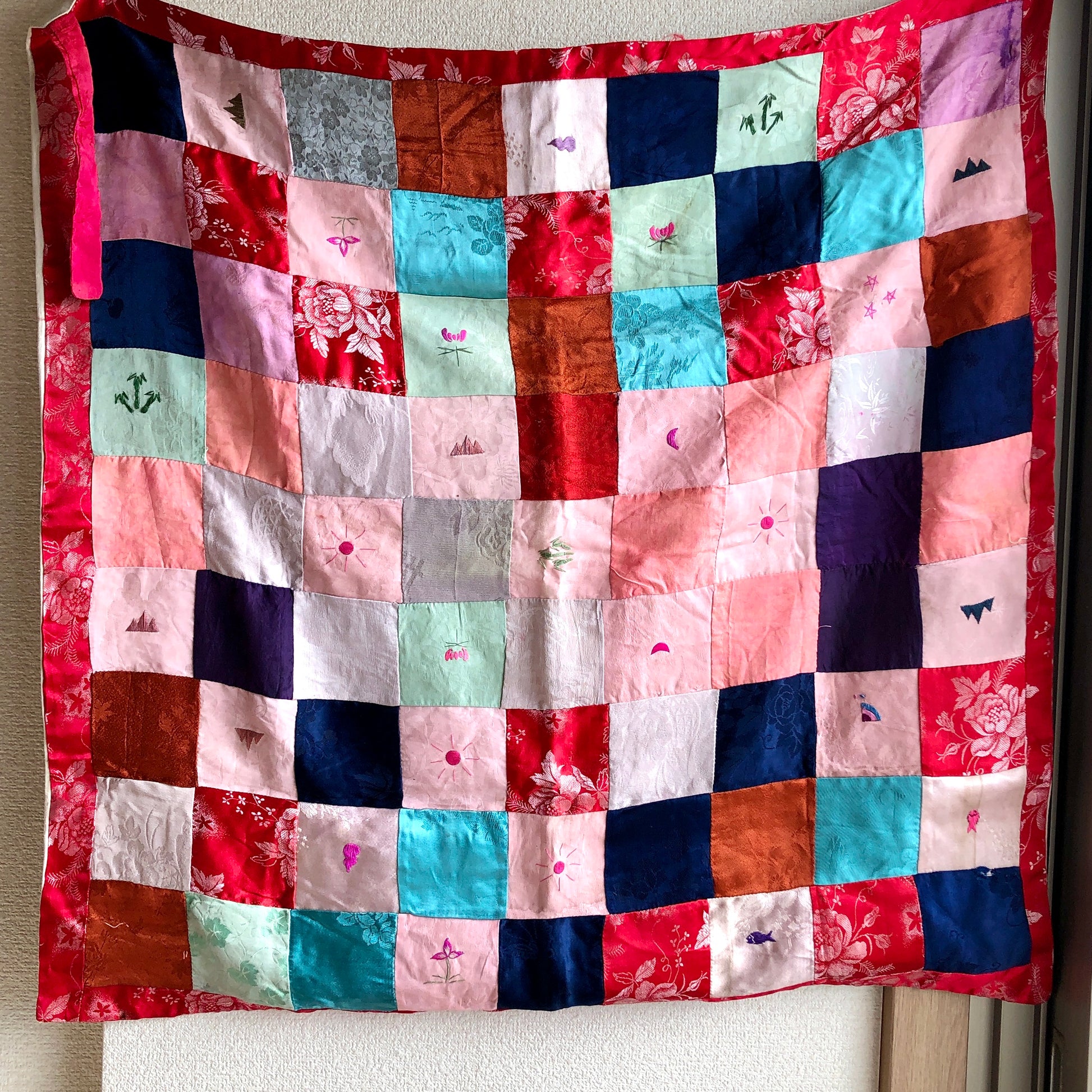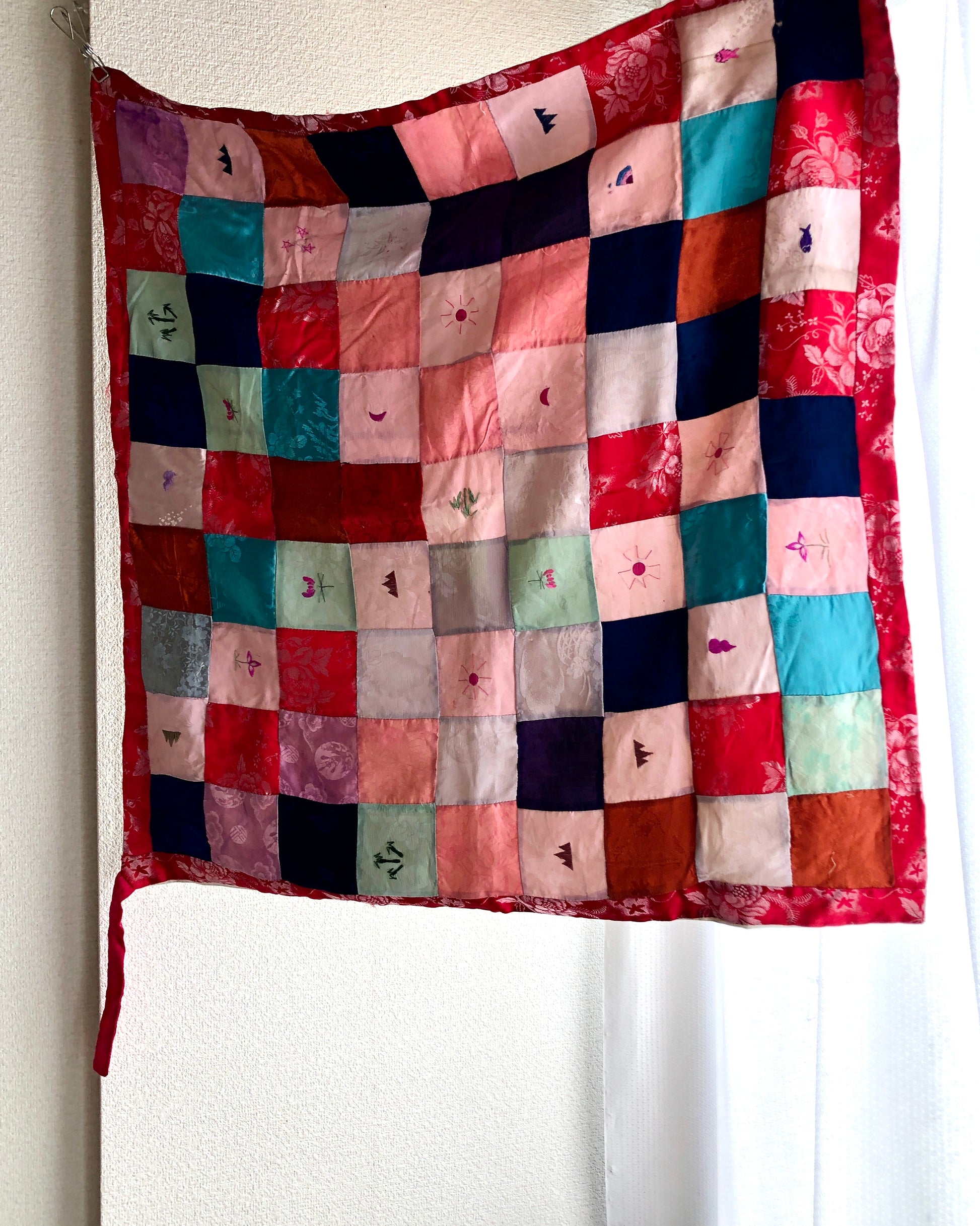 シルクと綿で作られたポジャギ。山や植物、魚や太陽、瓢箪などの素朴な刺繍が愛らしい一枚です。シルク地には、植物の織り柄が施されています。