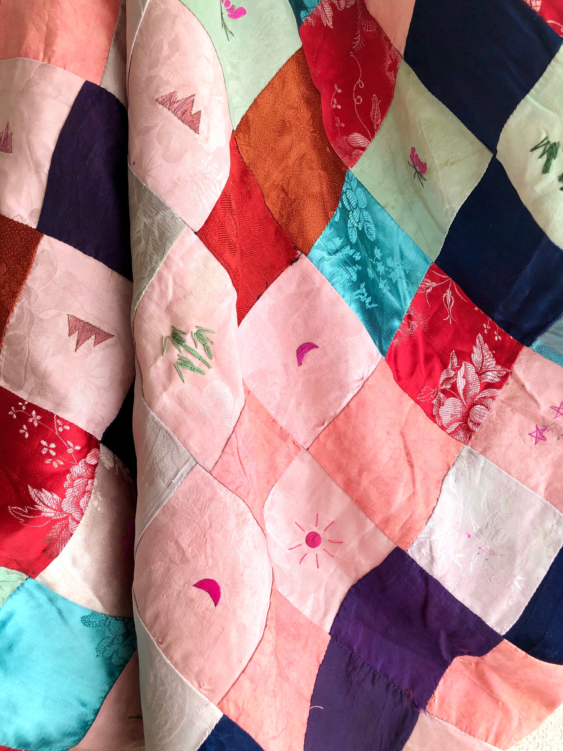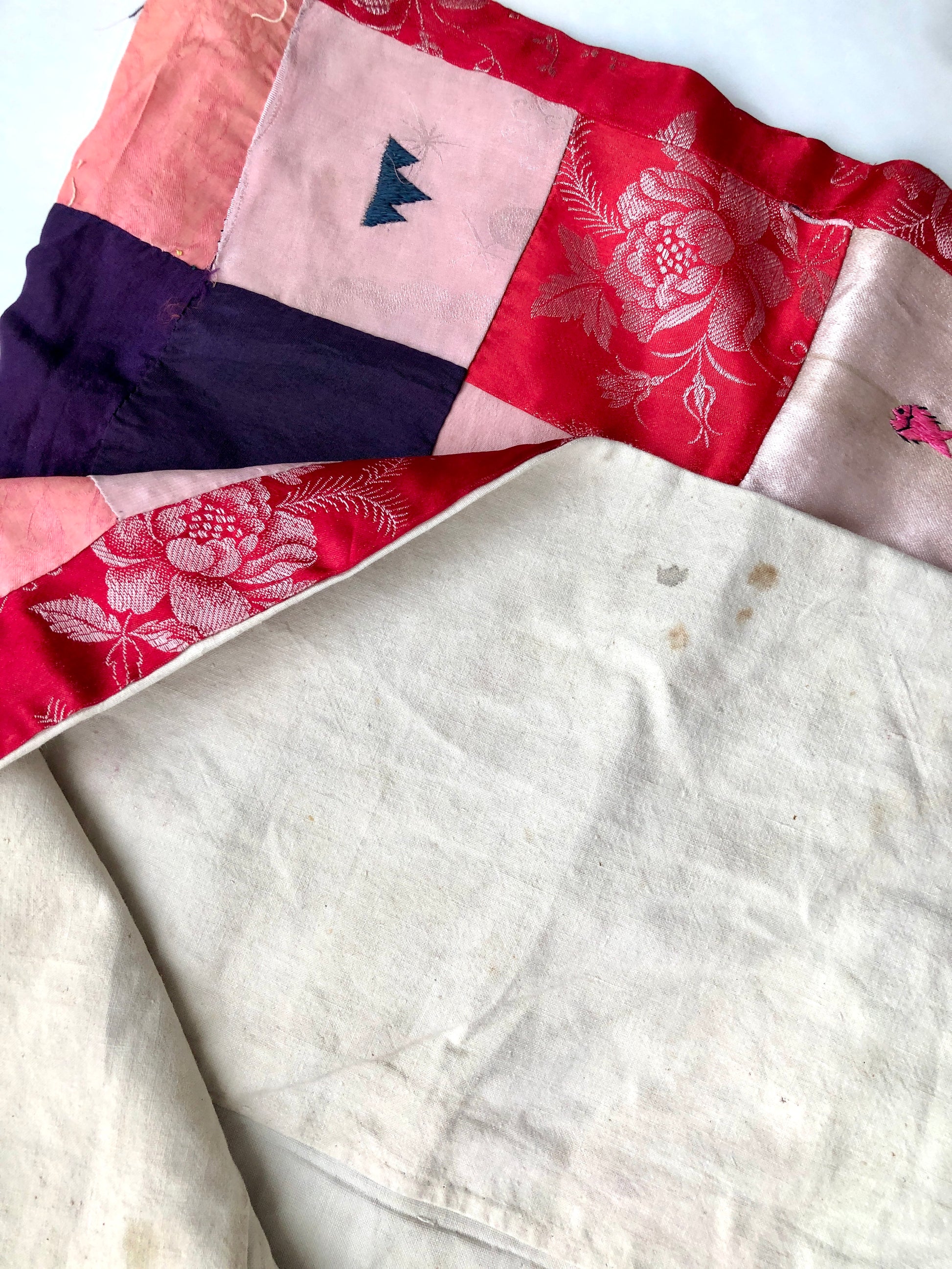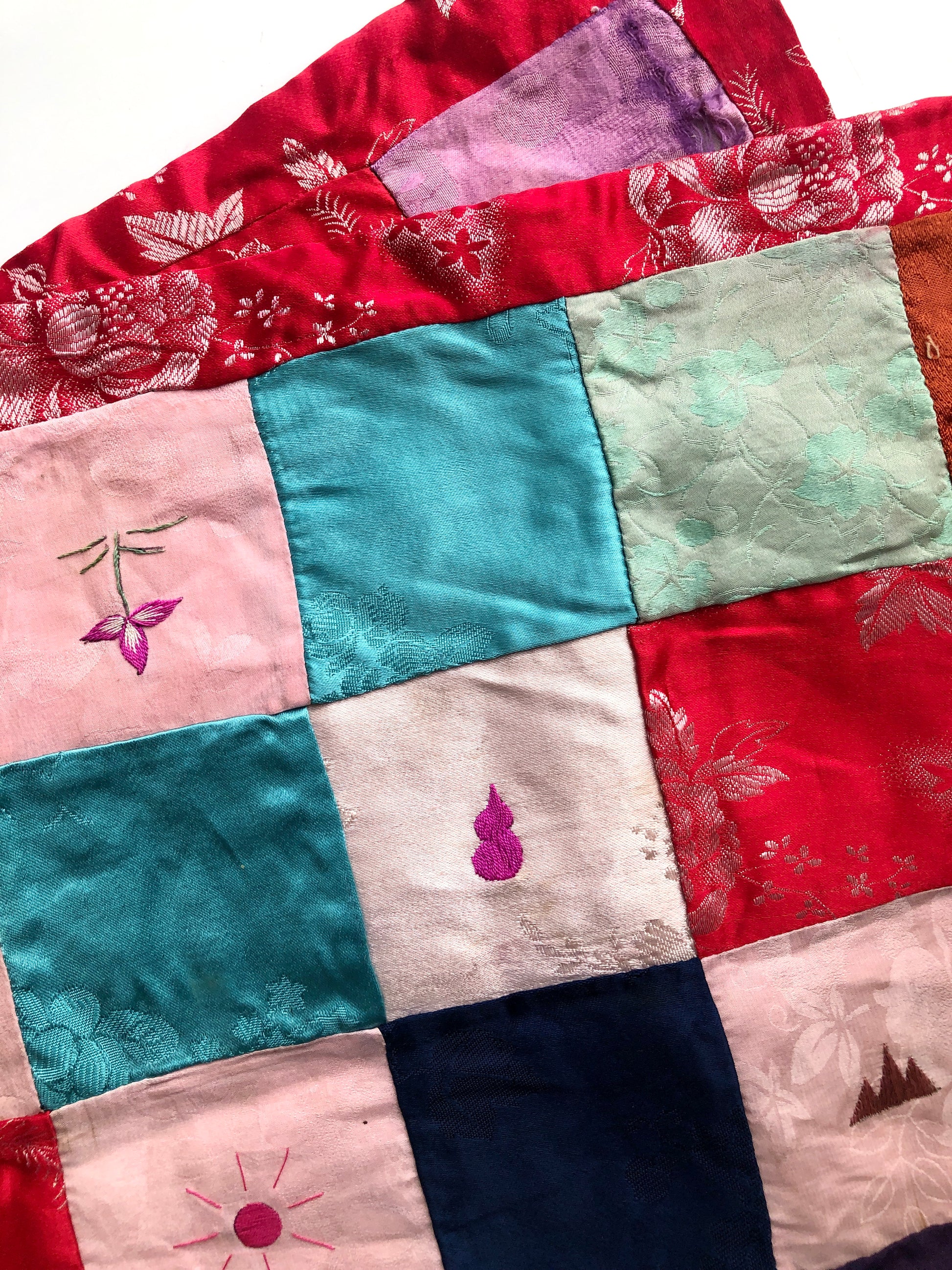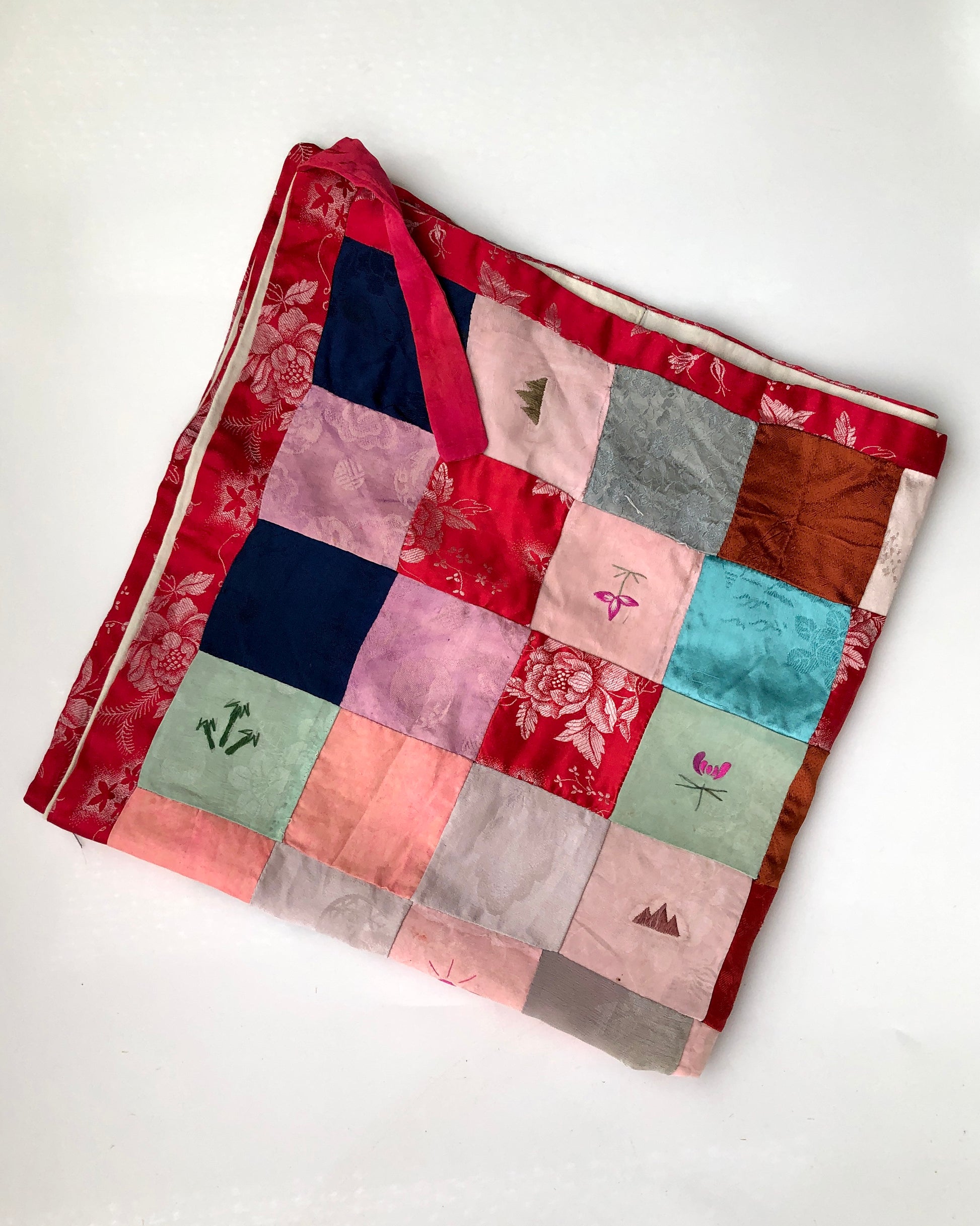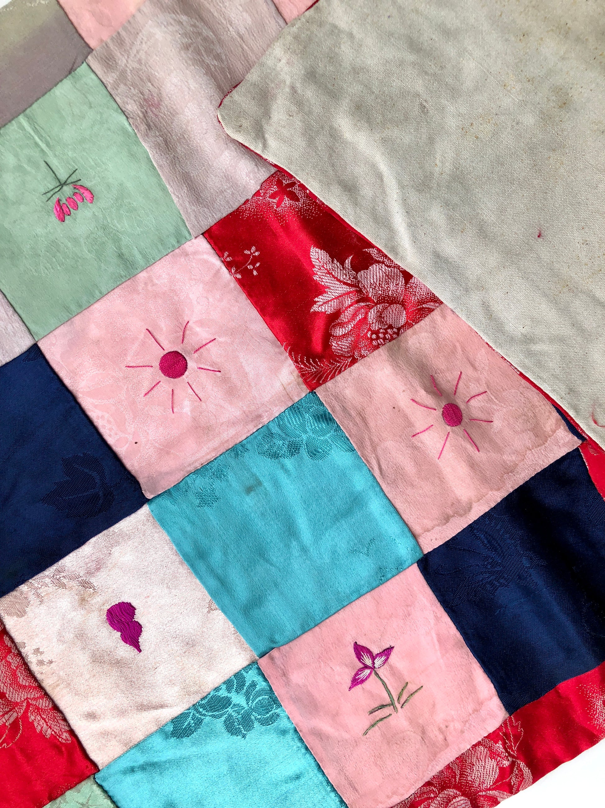 シルクと綿で作られたポジャギ。山や植物、魚や太陽、瓢箪などの素朴な刺繍が愛らしい一枚です。シルク地には、植物の織り柄が施されています。