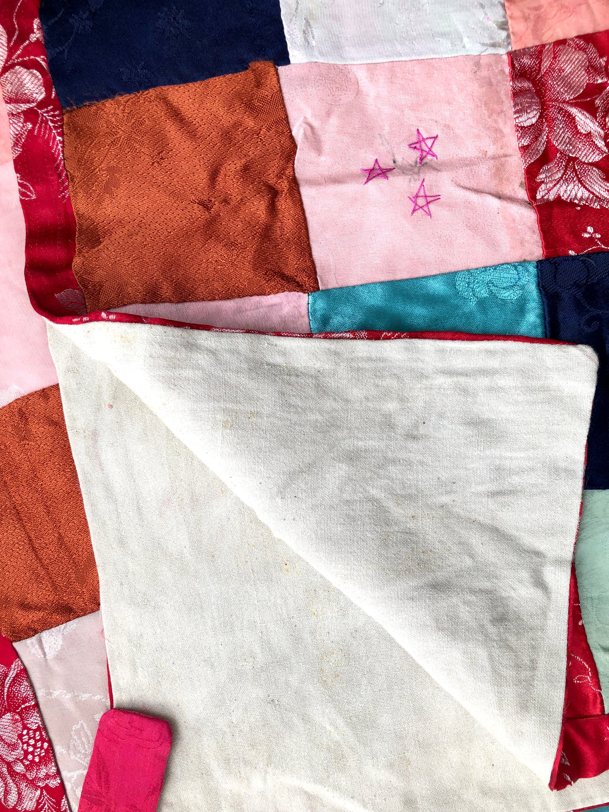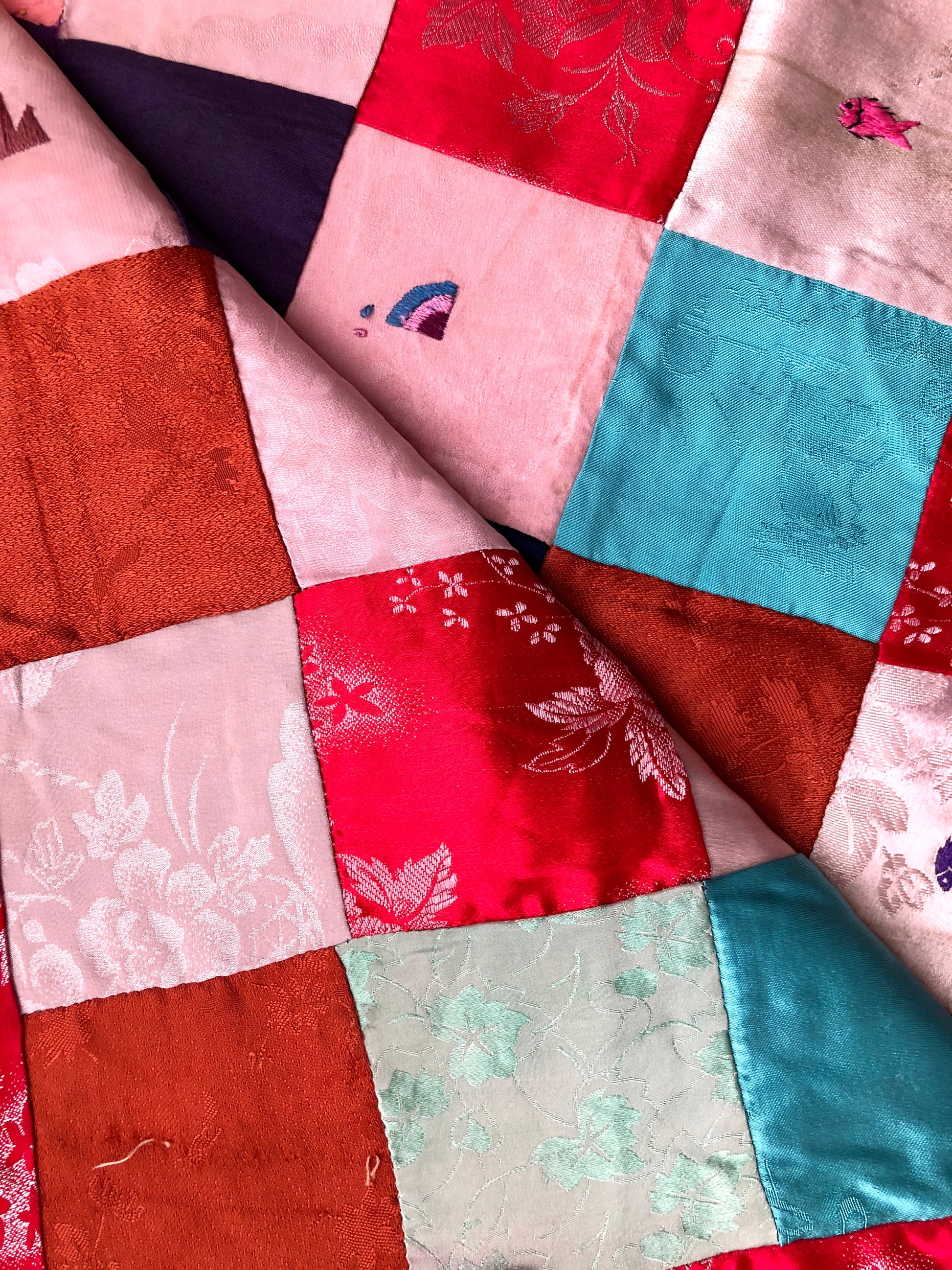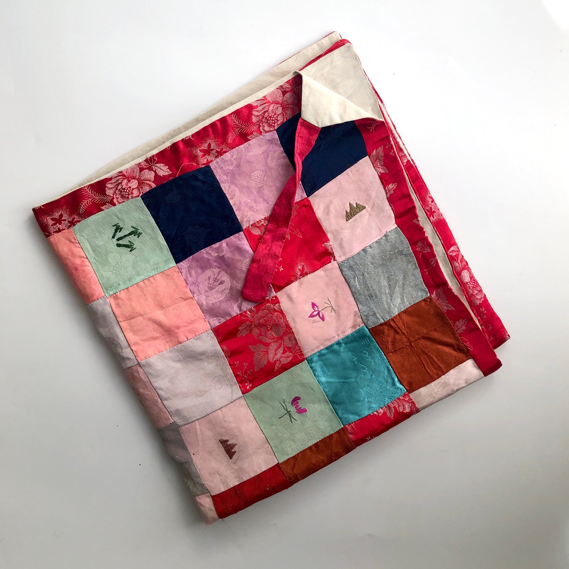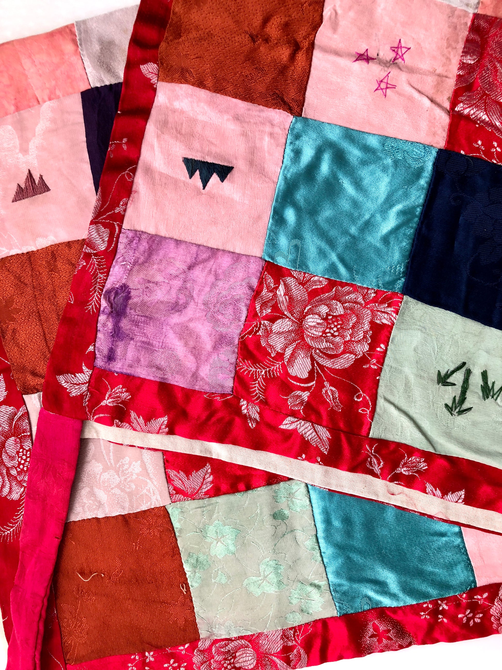 シルクと綿で作られたポジャギ。山や植物、魚や太陽、瓢箪などの素朴な刺繍が愛らしい一枚です。シルク地には、植物の織り柄が施されています。