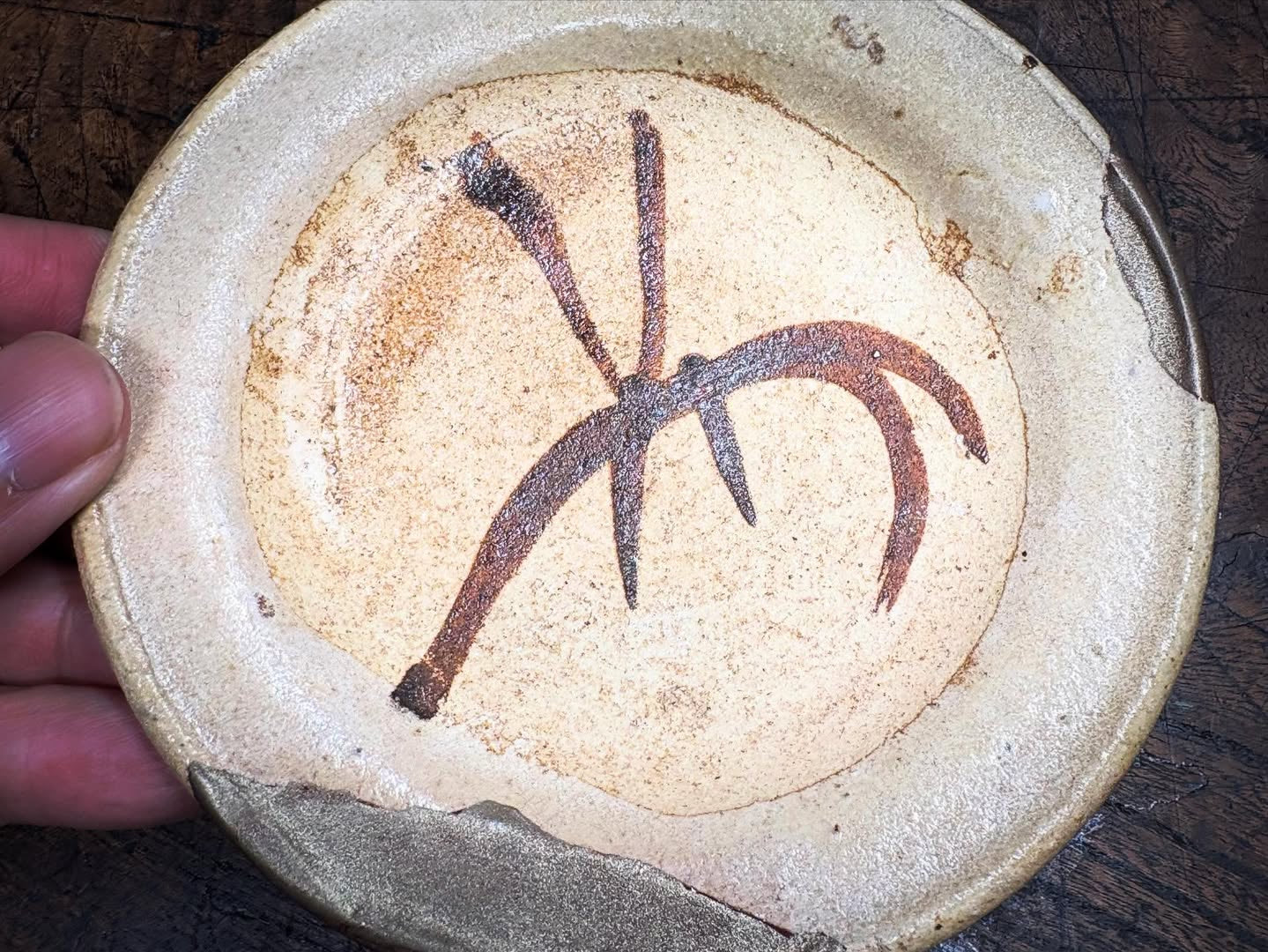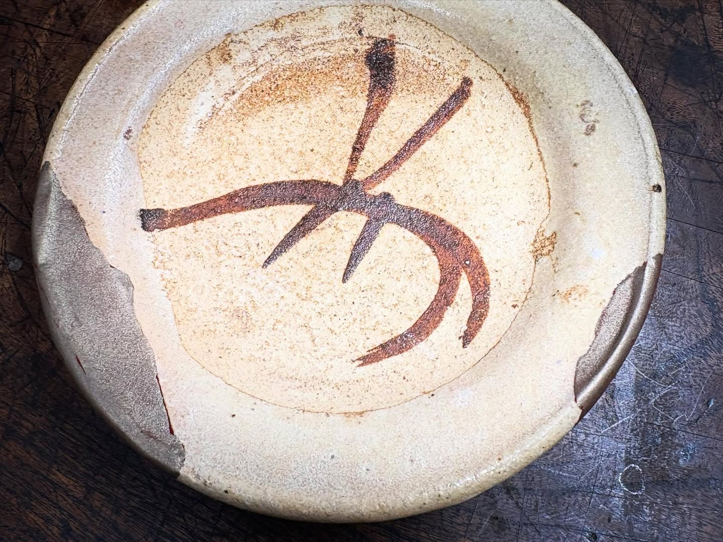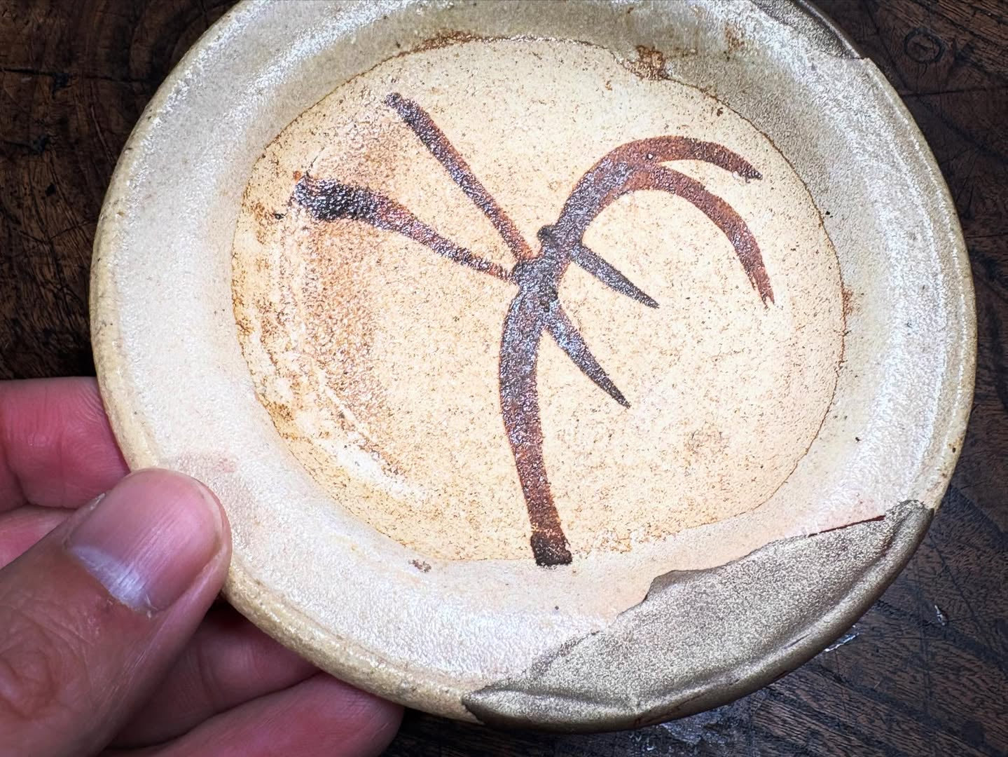 白洲正子「私の骨董」所載品と同手の、志野織部の小皿です。直径12センチ 高さ2.4センチ。江戸時代初期。発掘品のため口辺部に金継ぎ補修ありますが使用には問題ありません。参考のため「私の骨董」のページをUPしていますが本や所載品は付属しません。