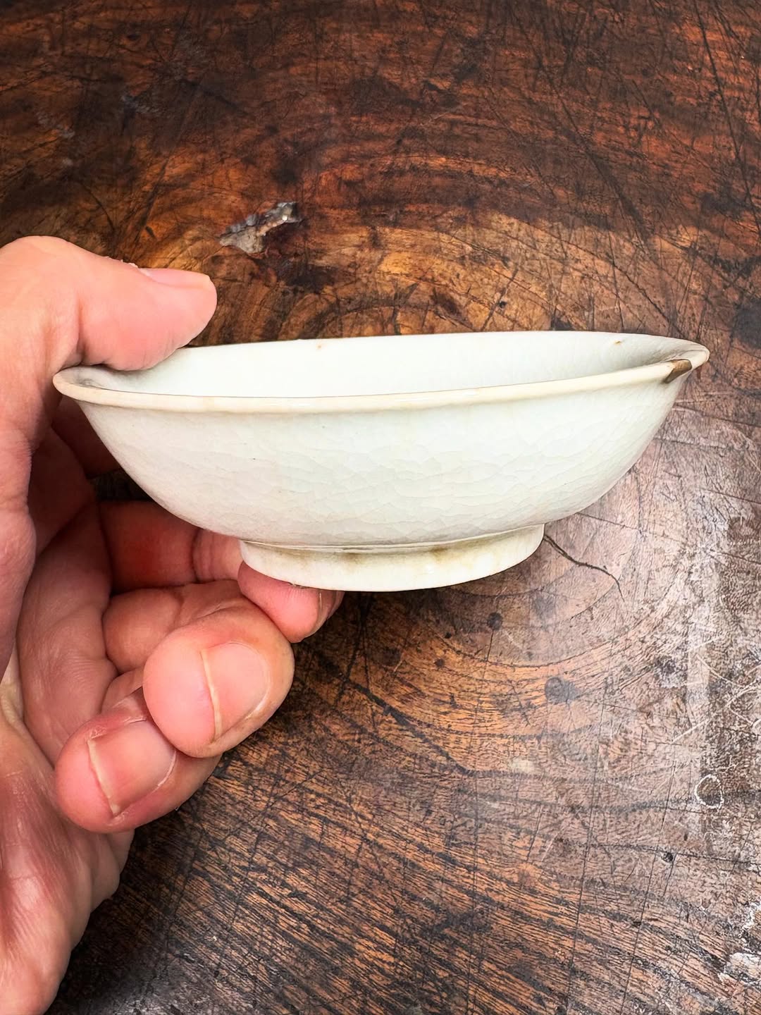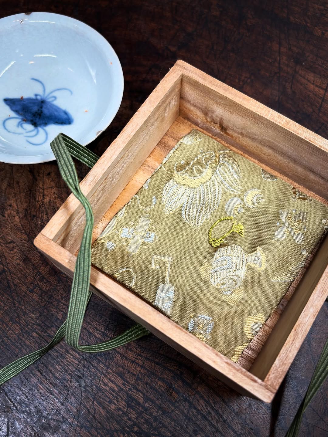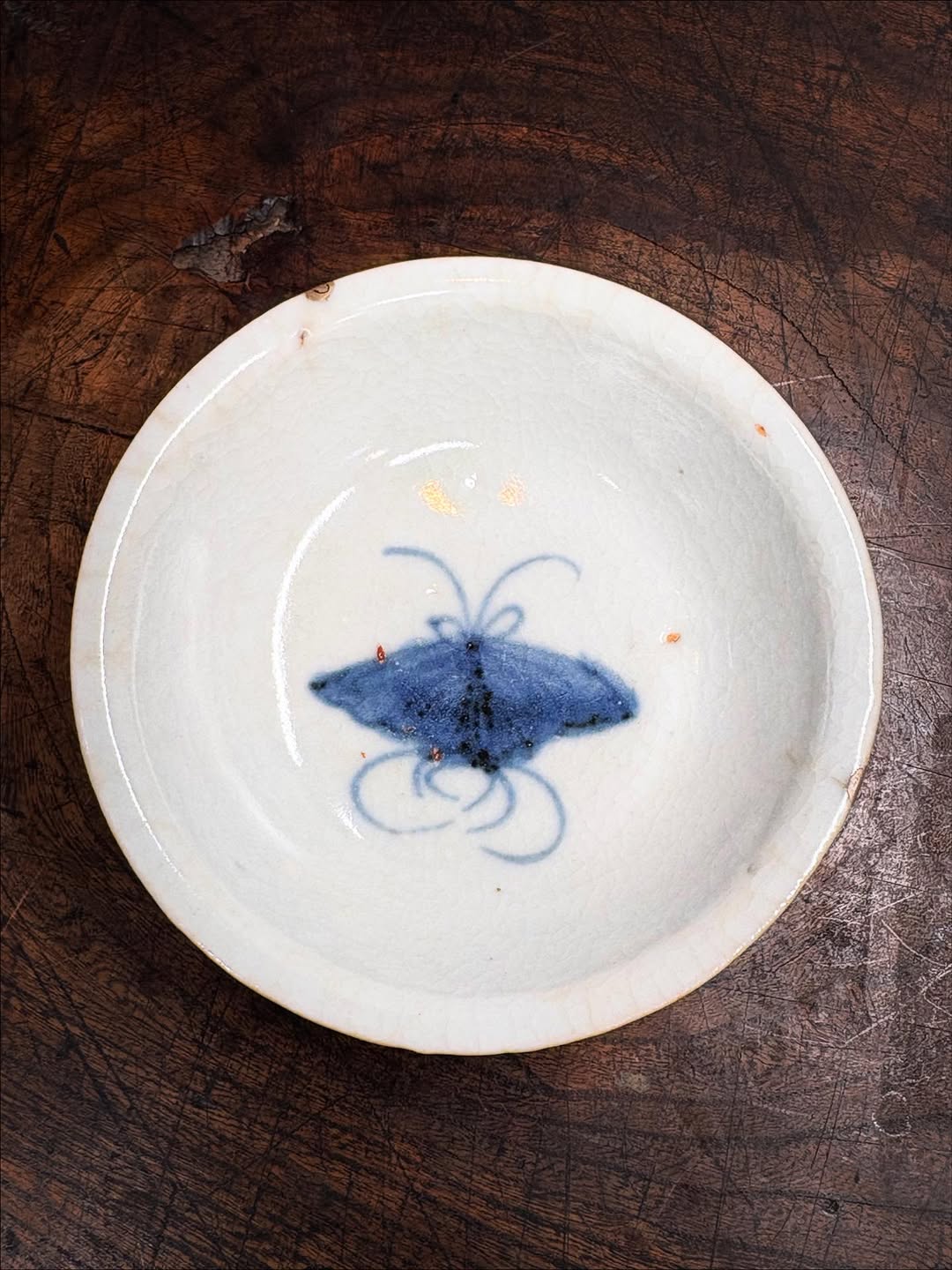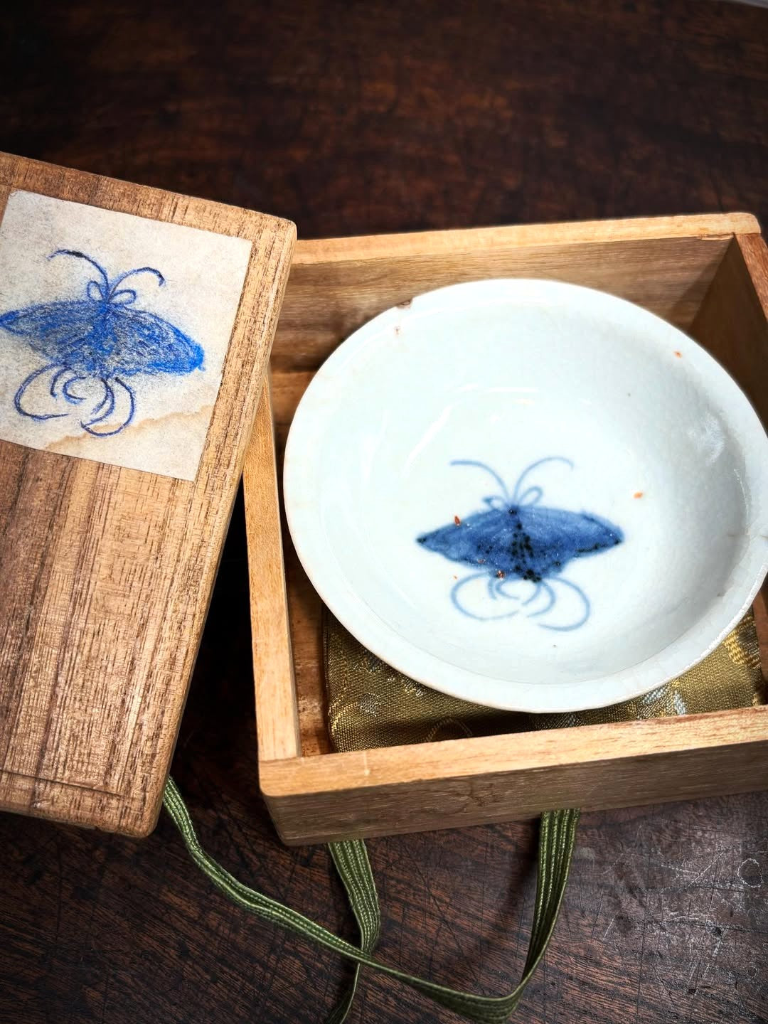 初期伊万里の蝶文盃です。直径9.1センチ、高さ2.9センチと平盃としてはベストサイズです。旧蔵者が大事にしていたのか、小さな座布団が敷かれた箱も付属します。口辺部に数ミリのホツ2か所、やや甘手などありますが観賞を妨げるものではありません。