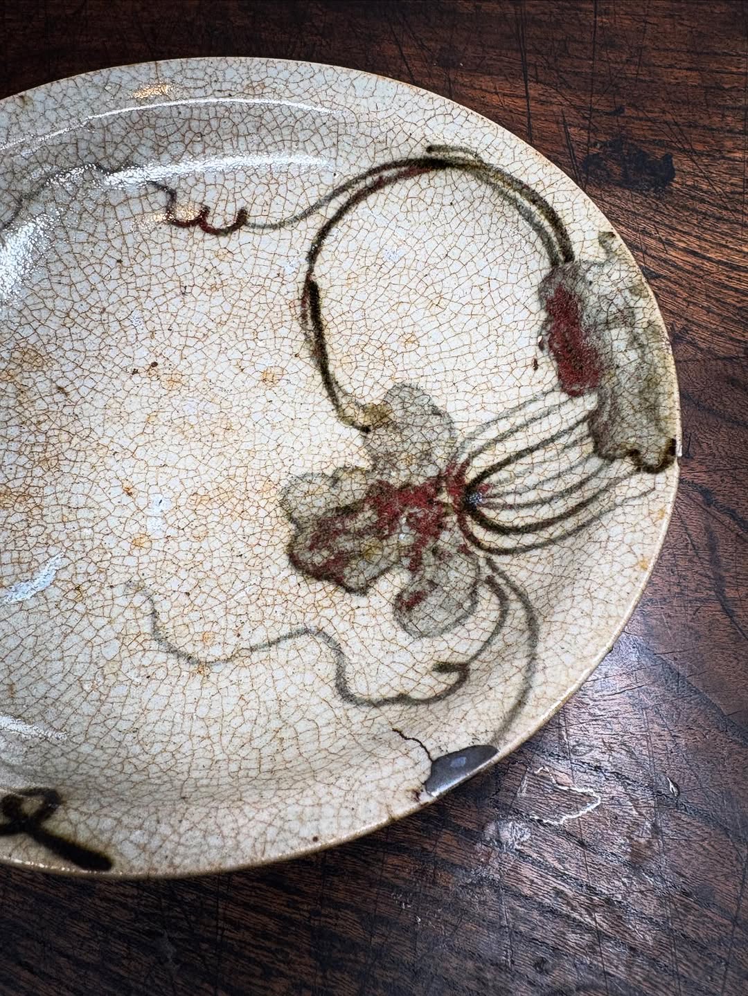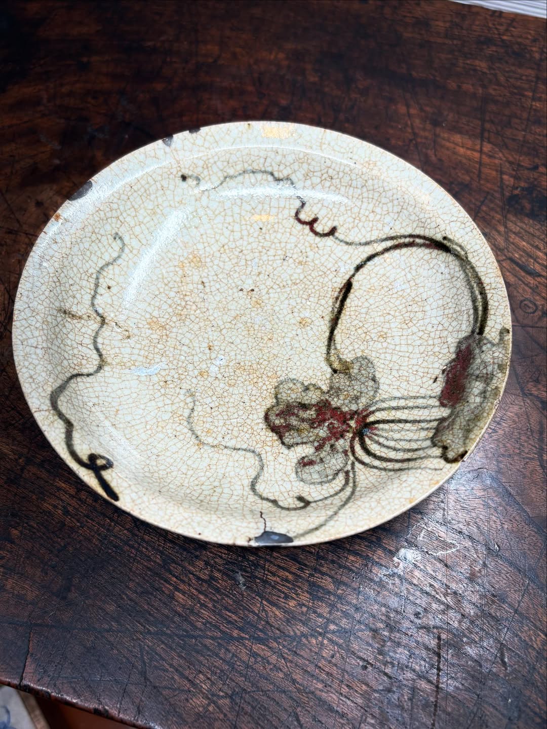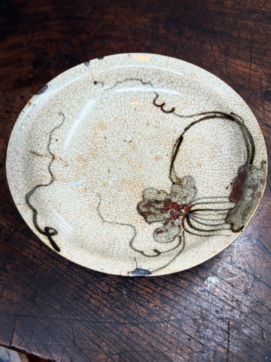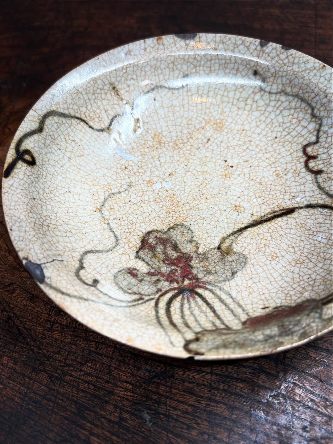 発色が鈍いですが辰砂で描かれた初期伊万里の皿です。鈍いながらも銅緑釉独特の色合いが面白いかと思います。甘手が育っており、ほぼ陶器のような風合いですが、それも魅力の一つえしょう。直径15.5センチ、高さ3.9センチです。口辺部に小さなホツの補修5か所あり。使用には問題ありません。