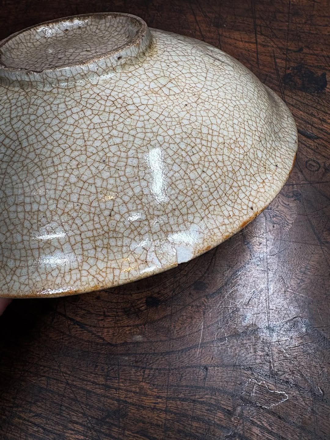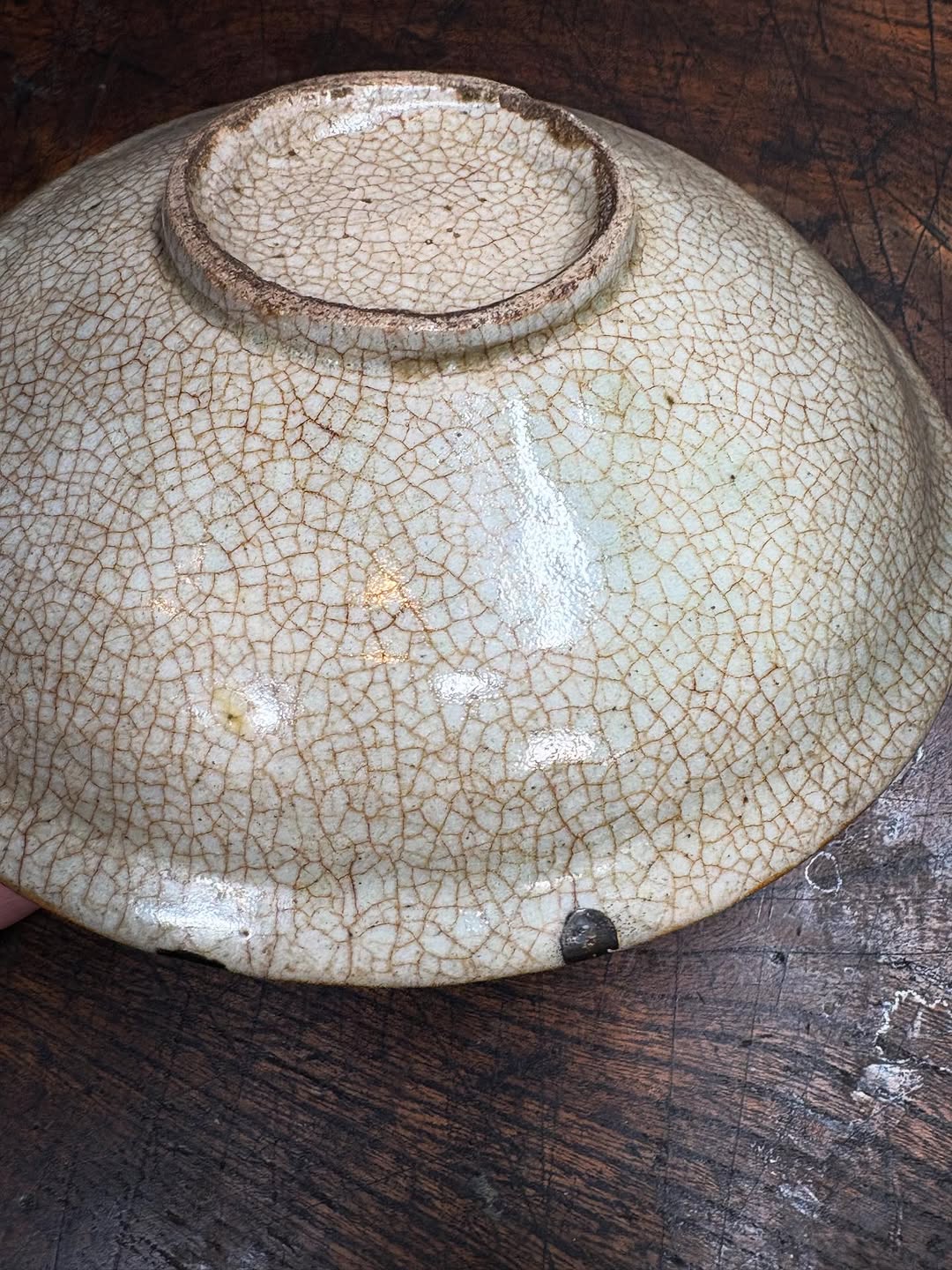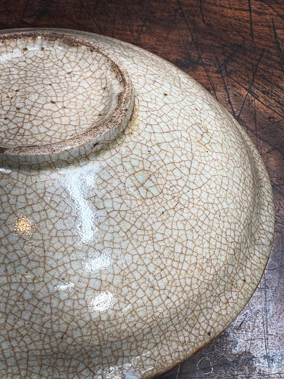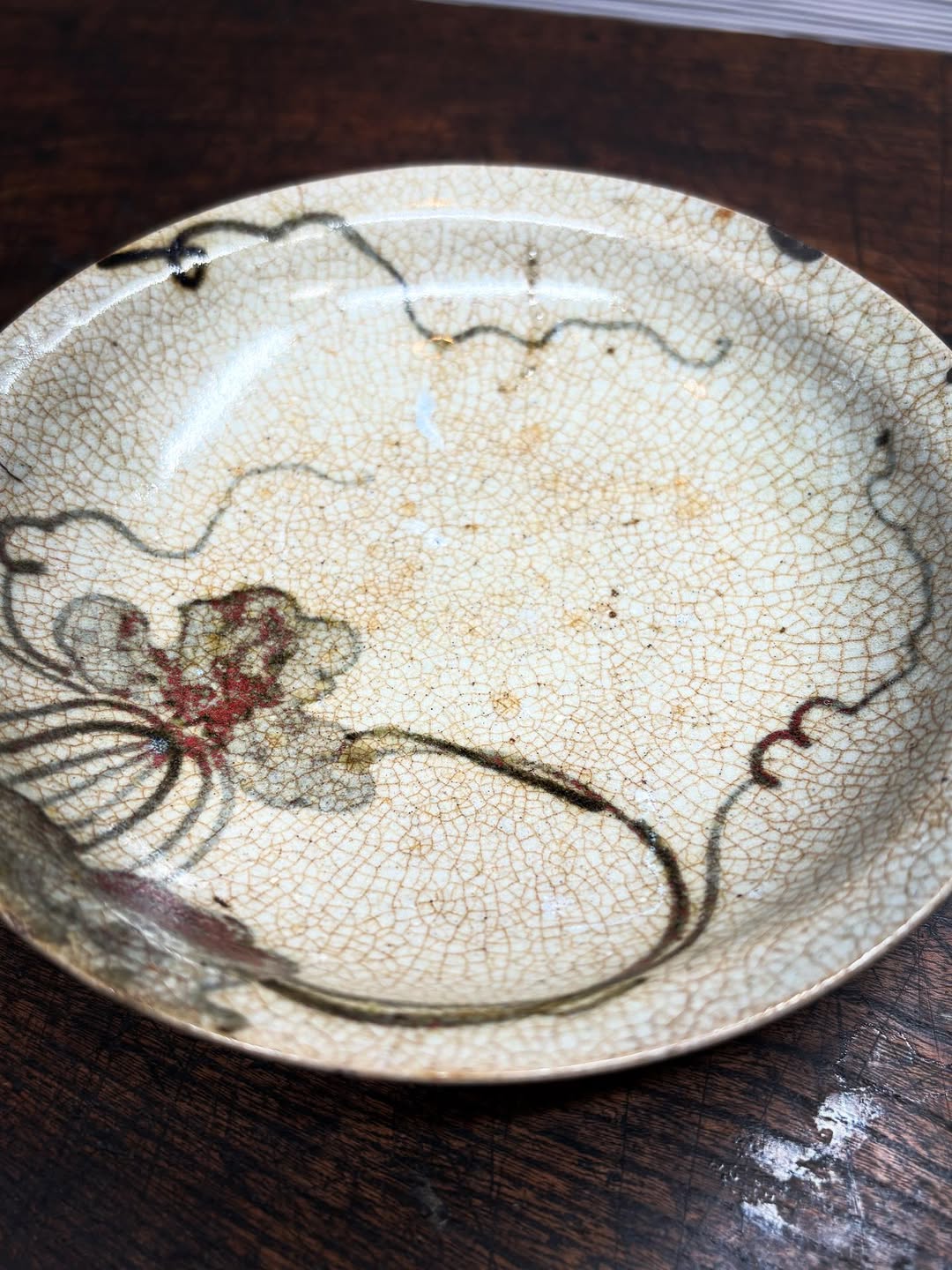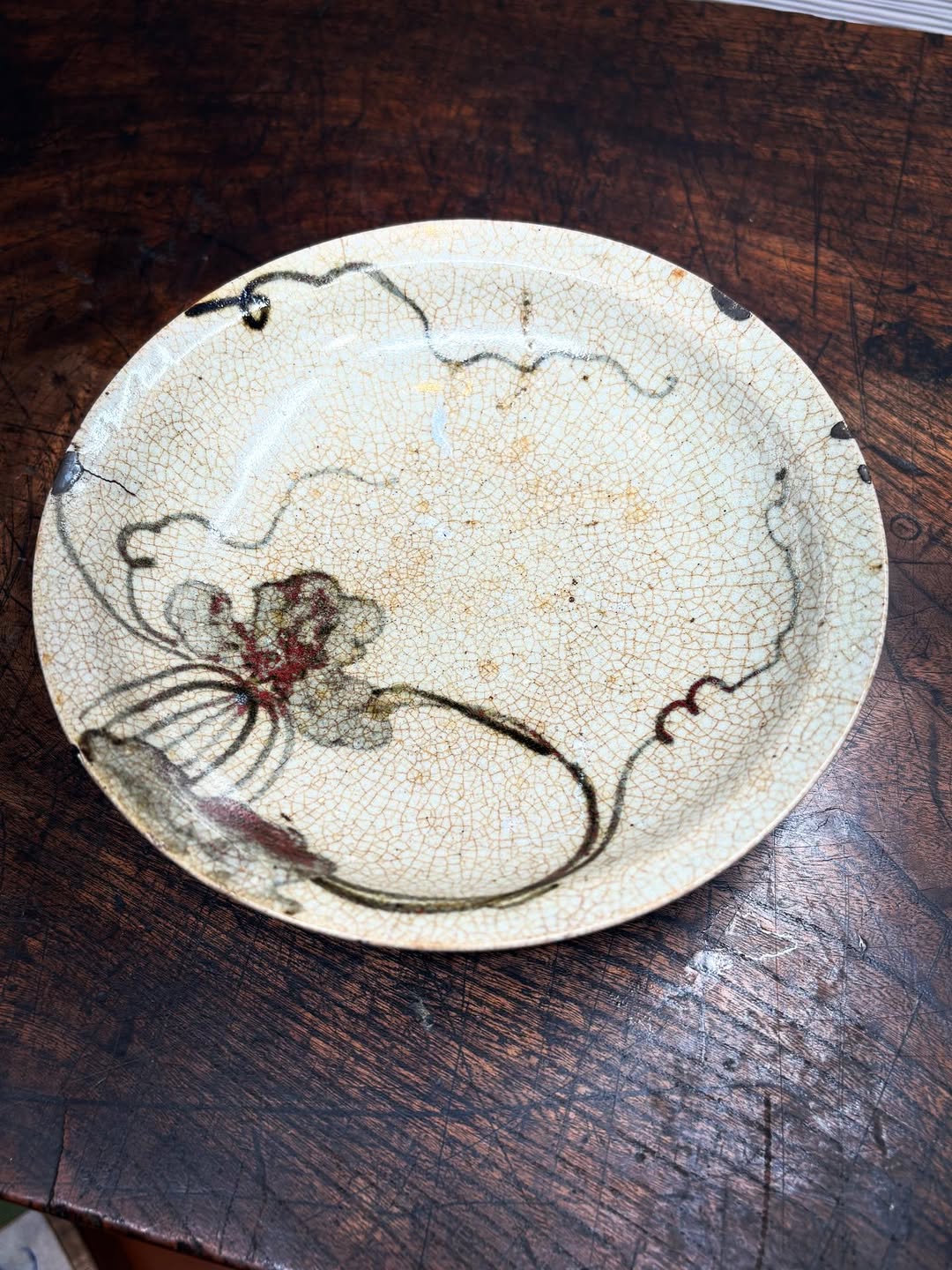 発色が鈍いですが辰砂で描かれた初期伊万里の皿です。鈍いながらも銅緑釉独特の色合いが面白いかと思います。甘手が育っており、ほぼ陶器のような風合いですが、それも魅力の一つえしょう。直径15.5センチ、高さ3.9センチです。口辺部に小さなホツの補修5か所あり。使用には問題ありません。