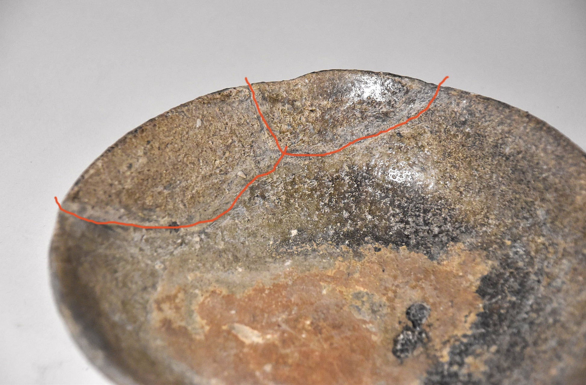縁に大きな割れと欠けの共色補修があります(朱線部分)。