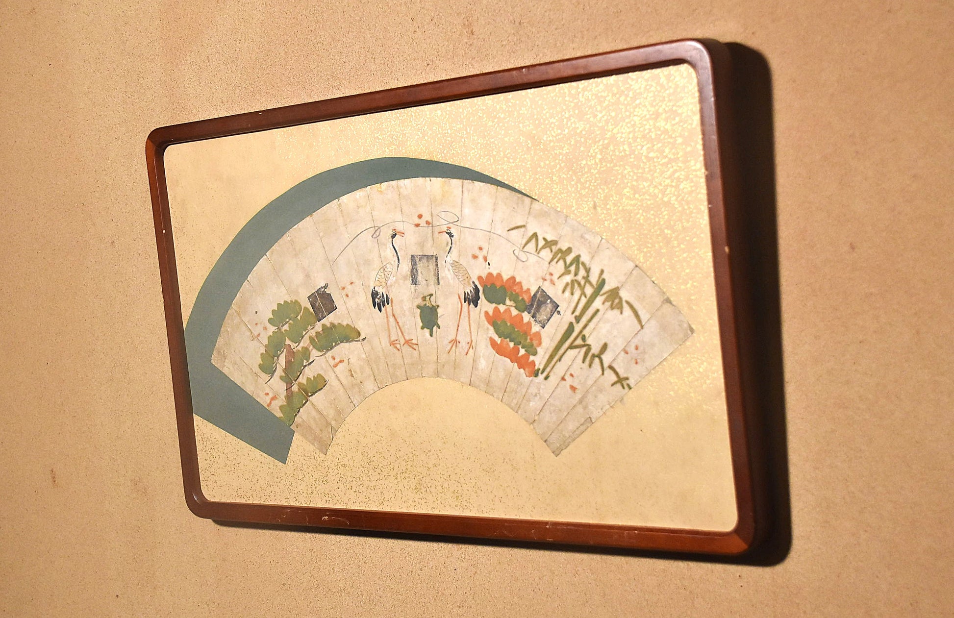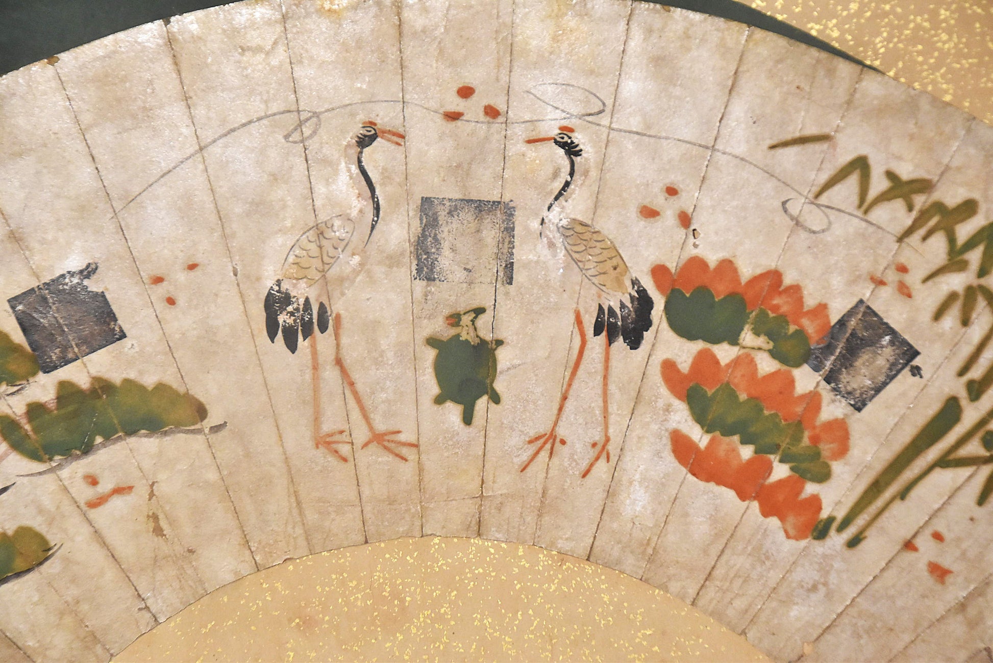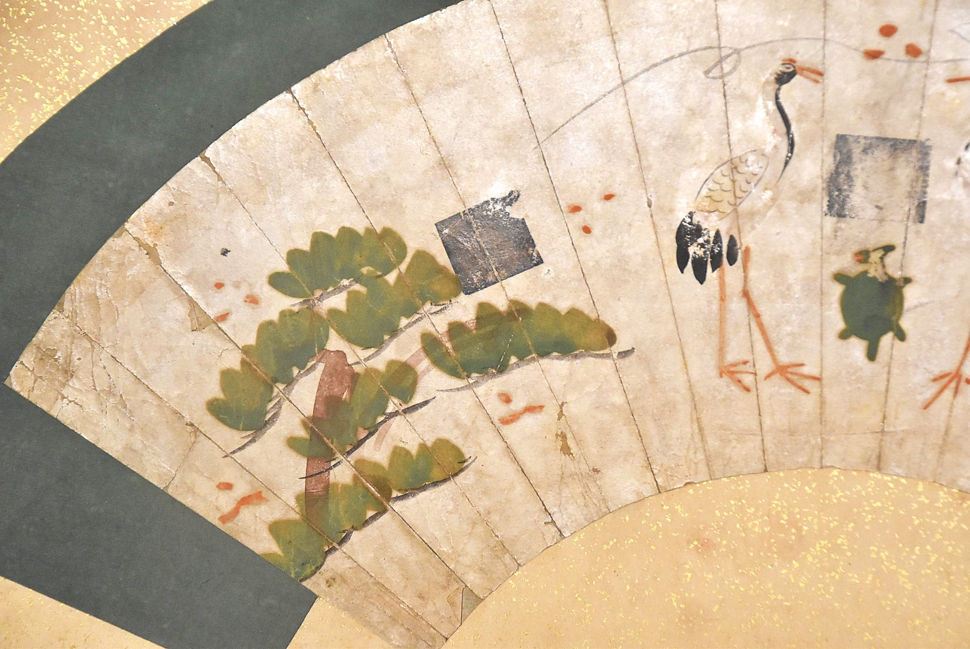 松竹と鶴亀が、平面的に構成された ユニークな意匠の扇面です。