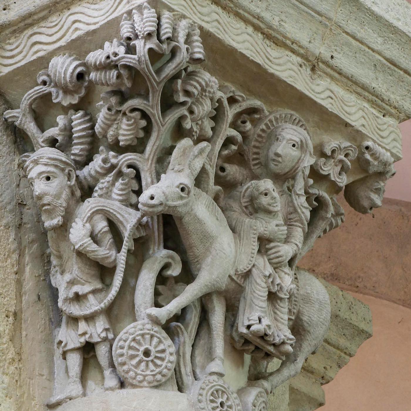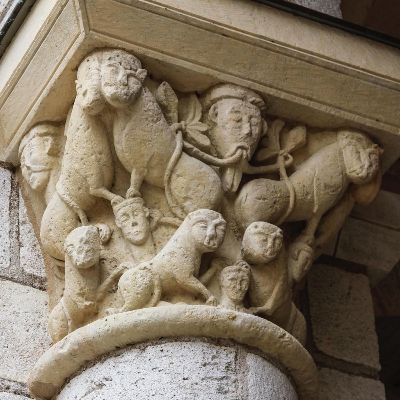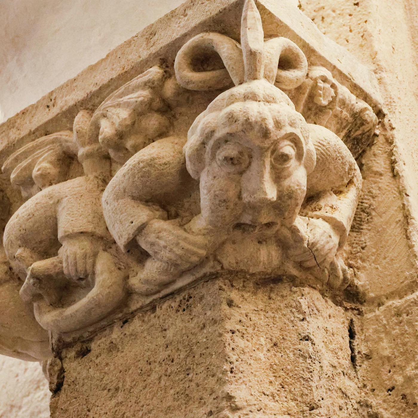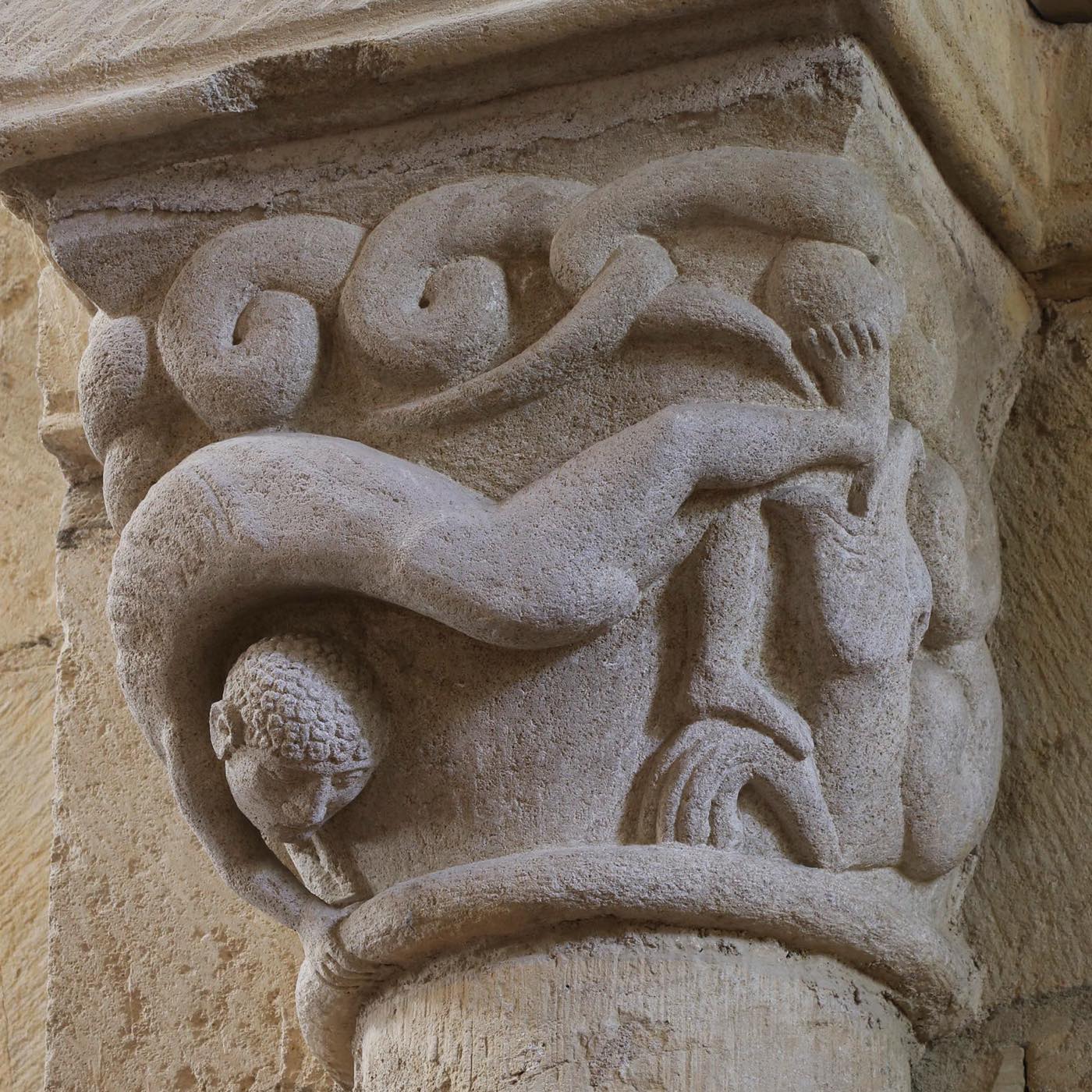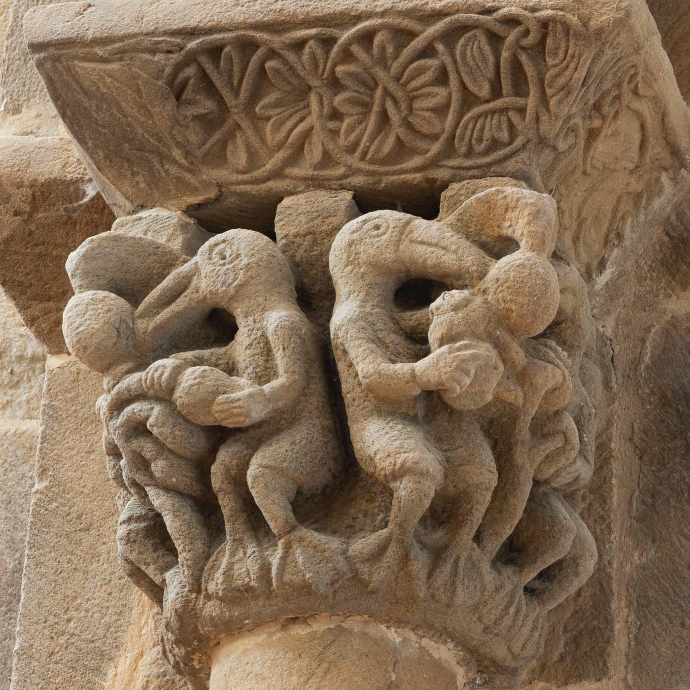 ロマネスクの彫刻的達成としてティンパヌムがありますが、それは、神殿を飾る古代彫刻の延長線上にあるものと見ることもできます。他方、バラエティ豊かな柱頭彫刻は、ロマネスク期の「発明」と云っても過言ではありません。古代の柱頭は描写空間ではありませんでしたが、ロマネスクの石工たちはキリスト伝や聖人伝、ギリシャ神話や怪物たちさえも彫りだしたのです。その後、ゴシック期になると再び植物文様に戻ります。